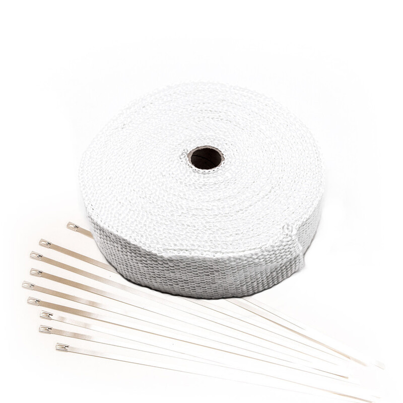 Rouleau de 15 mètres de bandelette isolante thermique de couleur blanche, largeur 50 mm, pour lignes et collecteurs d'échappement. Cette bandelette permet de contenir la chaleur des gaz d'échappement à l'intérieur des tuyaux qui en sont enveloppés. L'avantage est double : vous réduisez la température de votre baie moteur (un avantage indéniable pour un usage intensif sur circuit), et vous accélérez le débit des gaz d'échappement et donc réduisez le lag des turbos les plus gros (plus chauds, les gaz sont plus rapides).