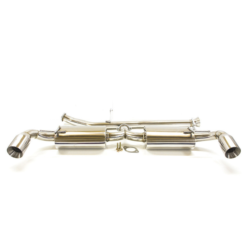 Le terme "catback" désigne les composants de la ligne d'échappement situés après le catalyseur. Ce catback pour RX-8 fabriqué par DriftShop se compose d'un tube intermédiaire en diamètre 2.5" (63 mm), et d'un silencieux doté de deux sorties en 3.5" (88 mm).